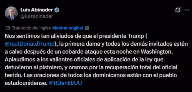 Tras los hechos, expresó su alivio porque Trump, la primera dama y el resto de los asistentes se encuentran fuera de peligro. El mandatario dominicano también elogió la actuación de los agentes del Servicio Secreto, responsables de detener al agresor armado.